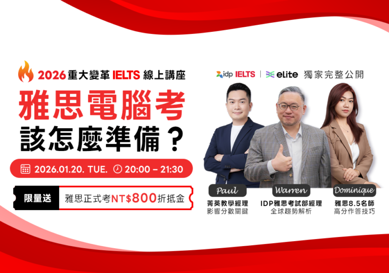 自2026年2月起,雅思電腦考將全面取代紙筆測驗。為協助考生順利銜接新制,菁英補習班特別攜手雅思官方IDP舉辦線上說明會,從官方政策解析到電腦考實戰操作重點,一次說明清楚。無論你正準備報考,或是想深入了解新制,這都是一場值得每位雅思考生參與的關鍵講座!